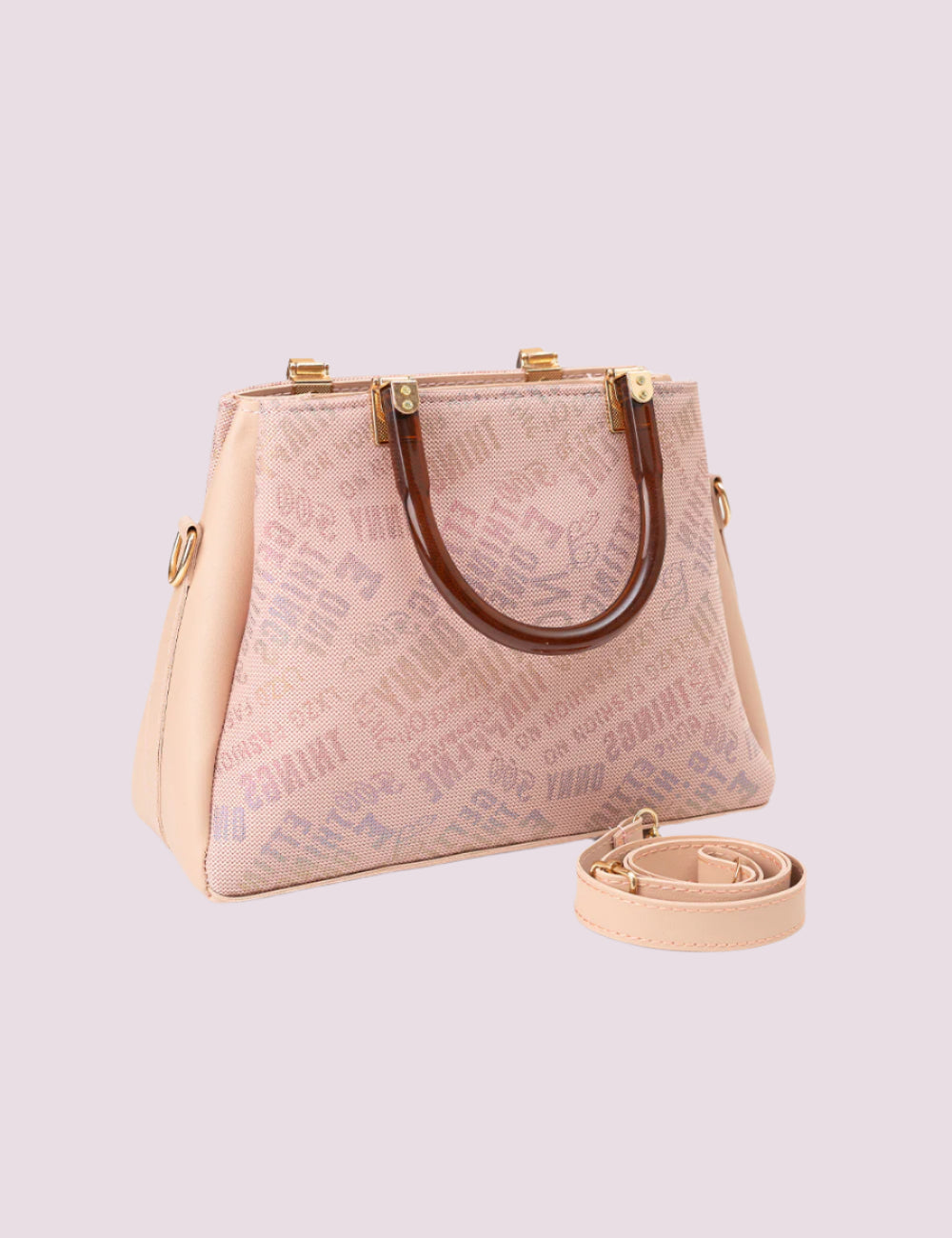 Introducing the 'Coral Charm Handbag'—a beautifully crafted accessory that combines practicality with timeless style. This exquisite piece is made from high-quality faux leather with a soft coral hue and features a tasteful monogram pattern that subtly stands out. The curved wooden handles provide a unique touch, enhancing the bag's visual appeal while ensuring comfortable carrying. This handbag is designed to accommodate your daily essentials, making it ideal for both professional settings and casual outings. Elegant and versatile, the Coral Charm Handbag is your perfect companion for any occasion.