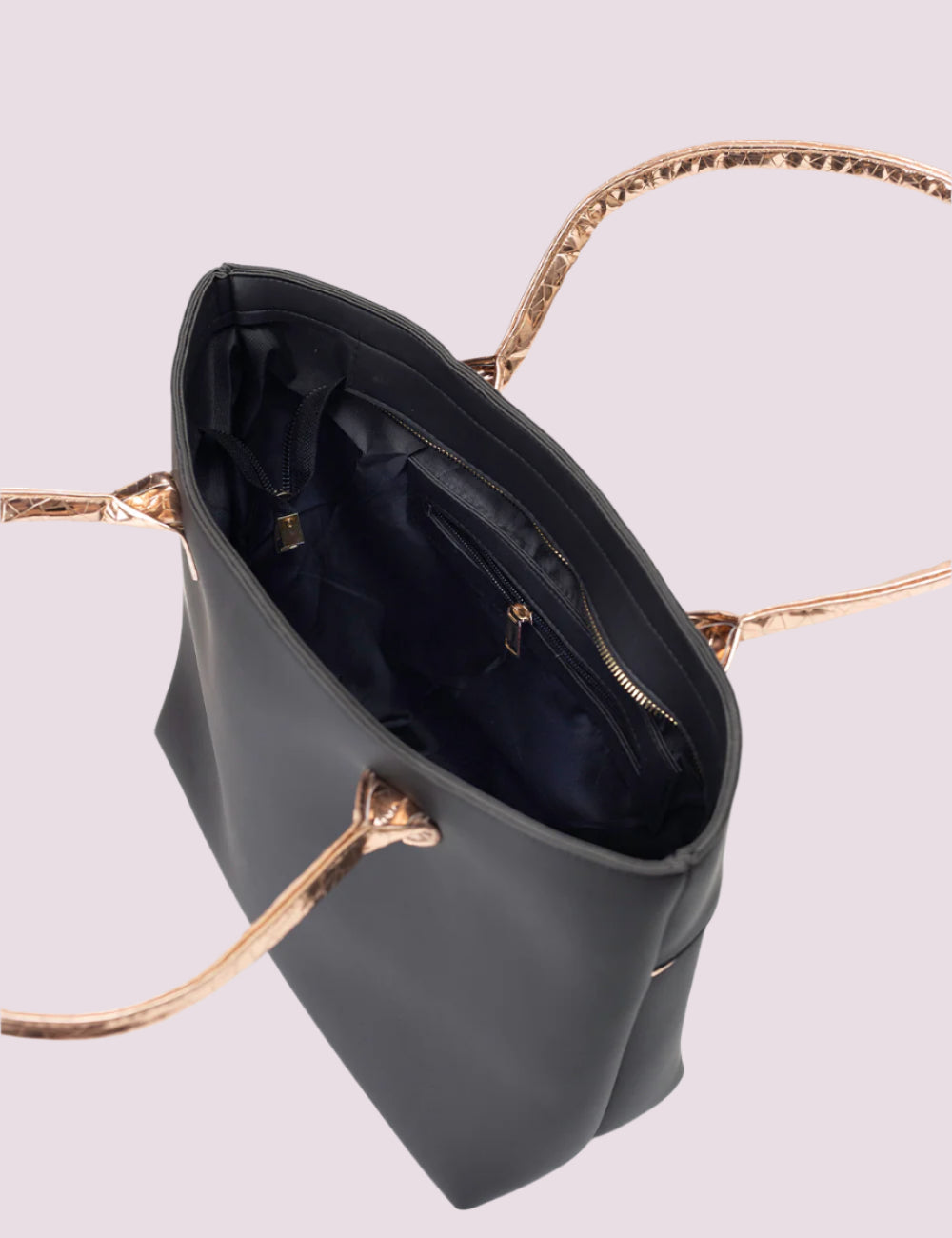 Step out in style with our Elegant Black Tote, designed to combine functionality with a touch of class. This tote features a sleek black exterior complemented by striking metallic gold accents, including a textured snakeskin pattern on the handles and a chic gold zipper for a hint of glamour. Perfect for the fashion-forward professional or the style-savvy traveler, this bag offers ample space for all your essentials. Whether you're headed to the office or out for an evening event, this tote is sure to elevate your ensemble.
