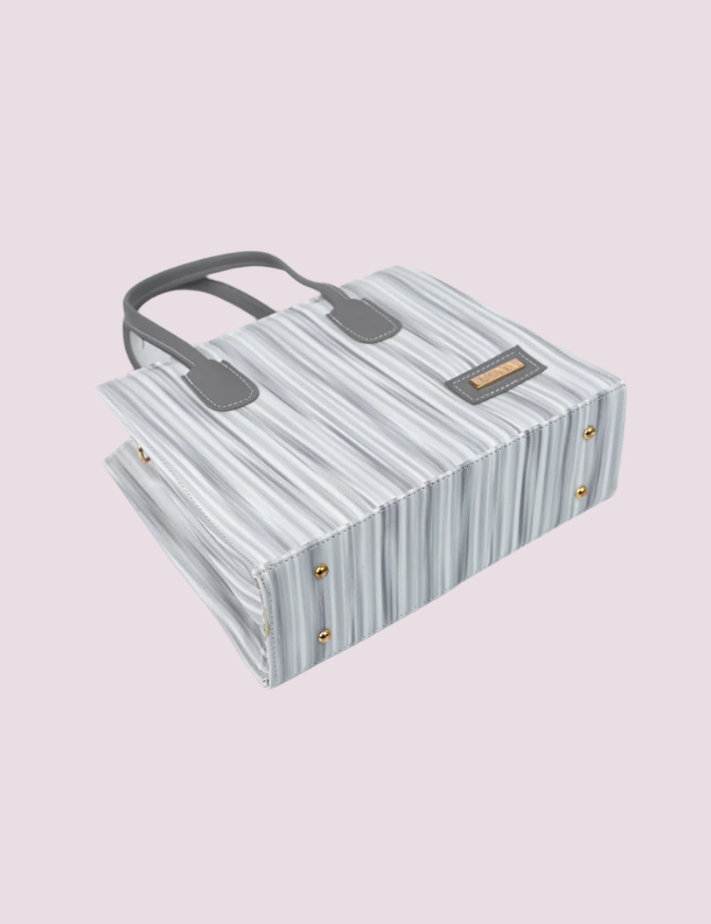 Introducing the "Grayline Panache" Tote, where modern design meets everyday functionality. This tote features a unique vertical stripe pattern in shades of silver and gray, offering a visual texture that is both striking and sophisticated. Crafted with premium materials, it boasts a sturdy construction with detailed stitching and robust handles, ensuring durability and comfort. The spacious interior, complemented by a sleek detachable shoulder strap, makes it an ideal choice for the fashion-forward professional or the stylish urbanite on the go.