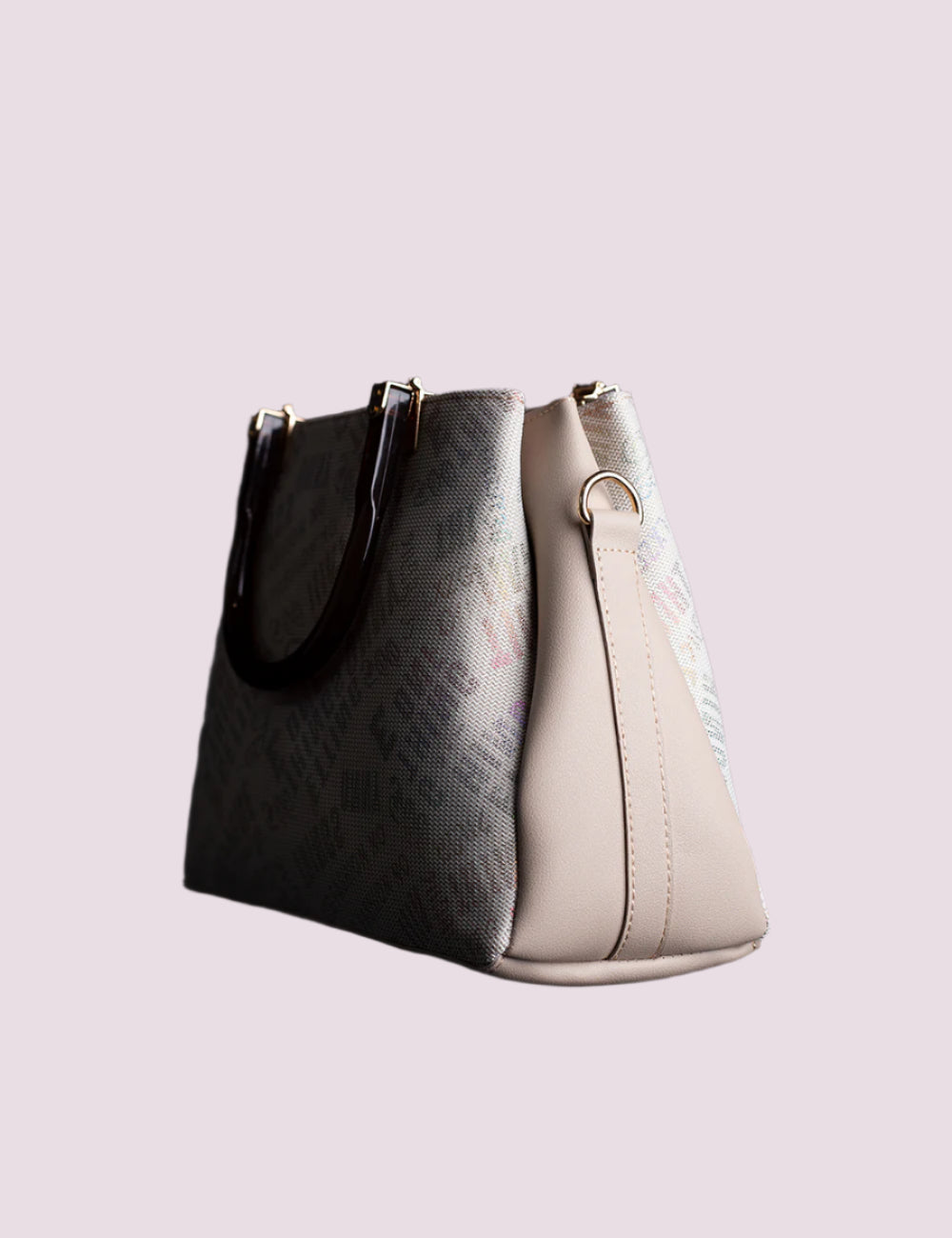 The Monogram Muse Handbag is a refined fusion of classic style and modern detail. Featuring a soft ivory canvas body with subtle multicolor monogram text, it brings a whisper of playfulness to a polished silhouette. The structured form is complemented by warm tortoiseshell-effect top handles and elegant gold-tone hardware, while sleek nude side panels add contrast and depth. Ideal for both casual and sophisticated ensembles, this bag delivers versatile elegance—perfect for the city stroll or the curated wardrobe.