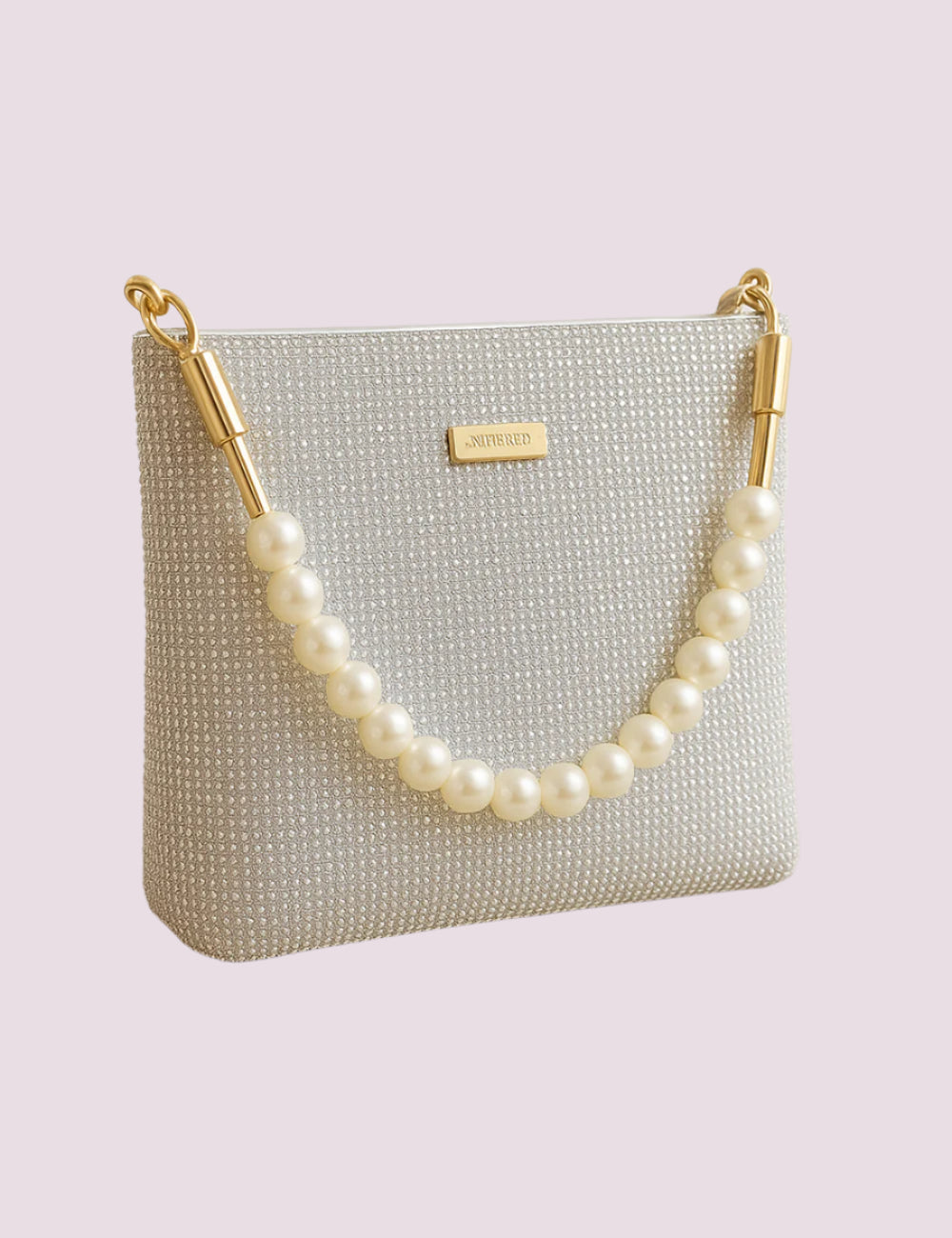 The Pearl Grace Bag embodies understated luxury with its sleek, structured silhouette and shimmering textured surface. Covered in a grid of fine metallic threads that catch the light with every movement, this elegant piece is accented by a lustrous faux pearl handle suspended from polished gold-tone hardware. A discreet gold logo plate adds a refined touch, reinforcing its upscale charm. Compact yet statement-making, this bag is the perfect accessory for formal events or chic soirées—offering timeless glamour with a modern twist.