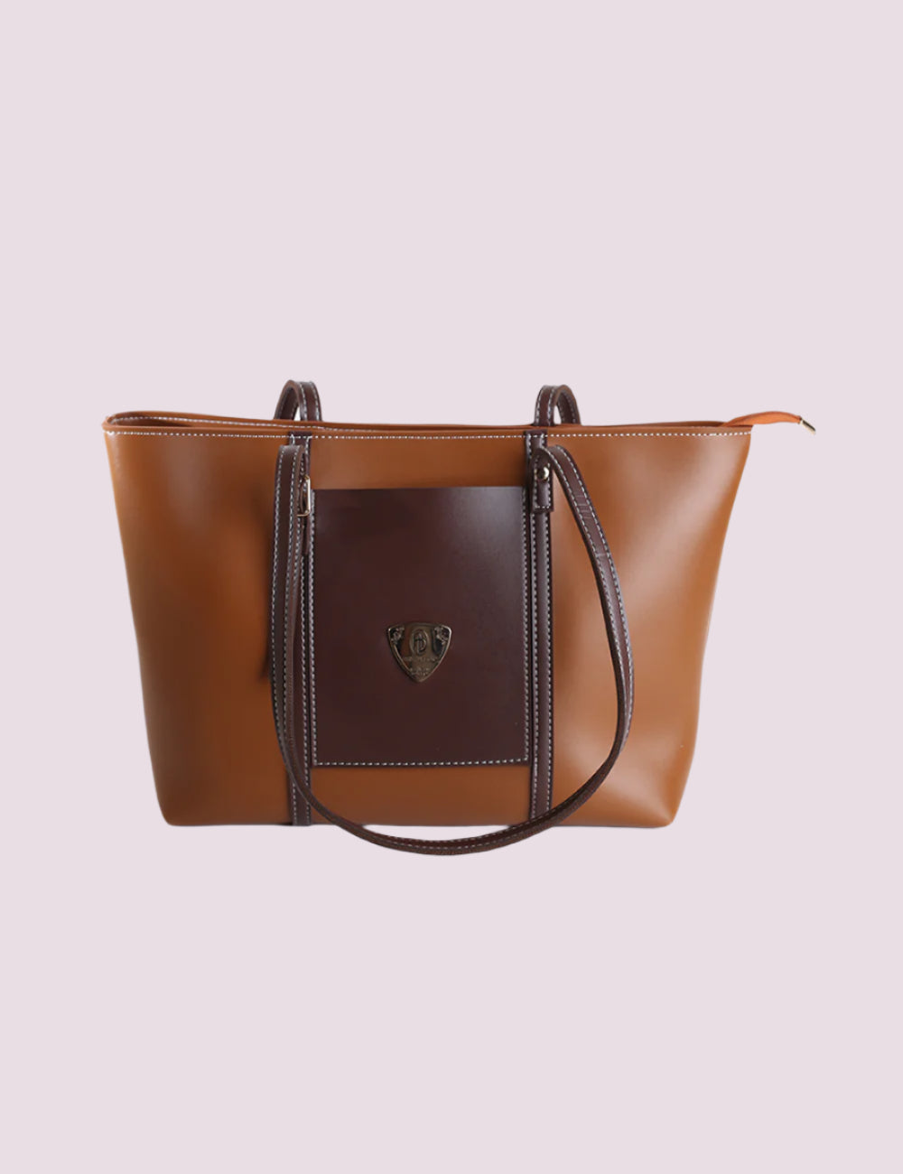 This stylish tote bag features a striking combination of brown leather, creating a sophisticated and modern look. The structured design and multiple compartments provide ample space for your essentials, making it perfect for work, shopping, or everyday use. The contrasting colors and gold-toned hardware add a touch of elegance and personality.